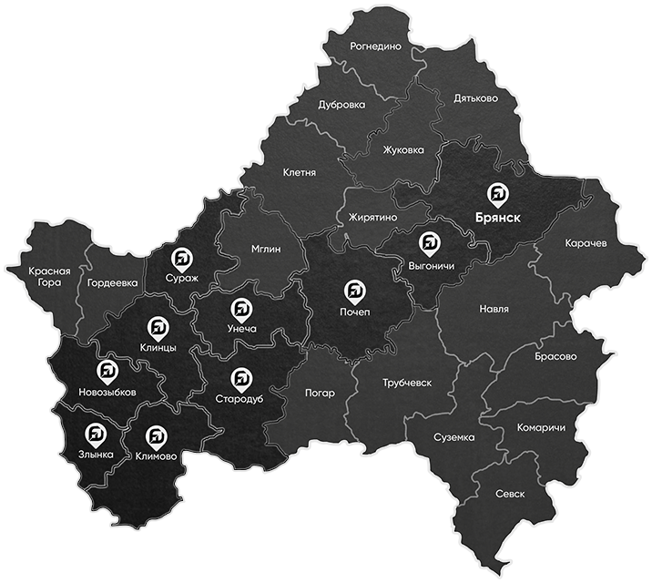 Доставка возможна по следующим городам: Брянск, Новозыбков, Злынка, Климово, Клинцы, Унеча, Почеп, Сураж, Стародуб, Глинищево и по районам.